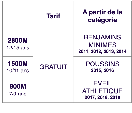 Nous attendons tous les jeunes nés entre 2011 et 2019 pour parcourir 3 distances adaptées à leur niveau. Attention : selon les règles FFA, c’est l’année de naissance qui prime et non l’âge (nous ne donnons les âges qu’à titre indicatifs).